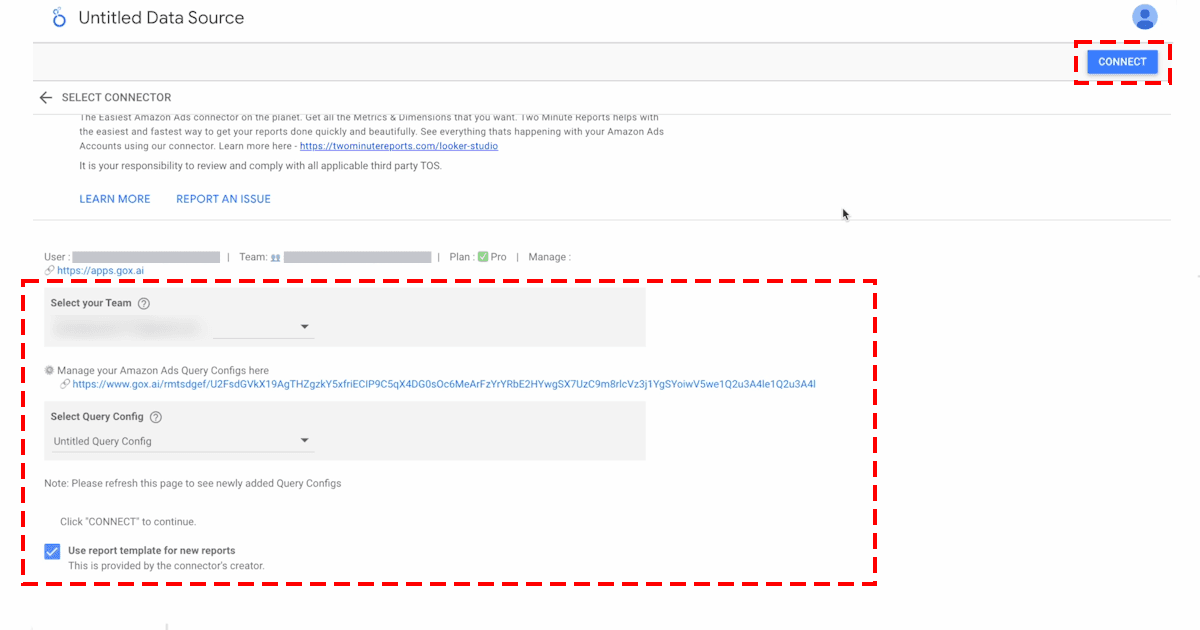 - Then, select the relevant Query Config for the data source and click on the Connect button at the top-right corner. This step connects TMR to Looker Studio.