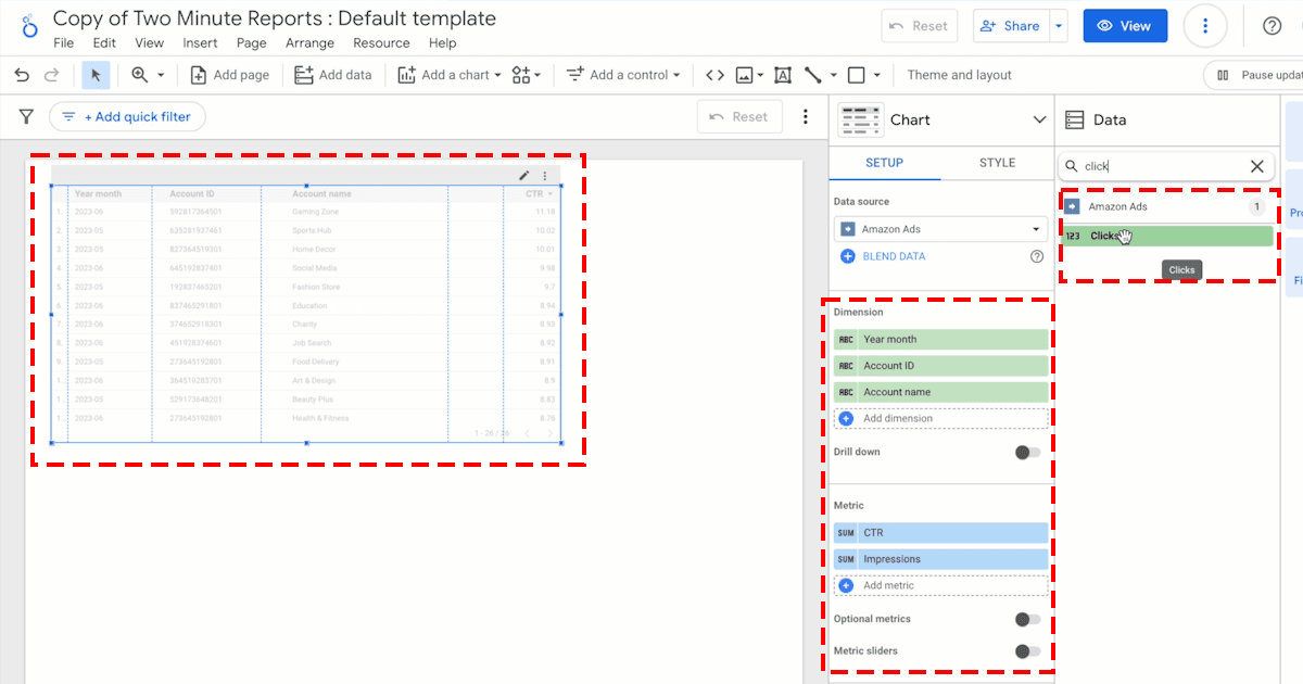 - With the table/chart selected, choose the metrics that you need in your report. Explore the categories in the “Metrics” dropdown menu, like Engagement, Clicks, or Impressions, and add them to your report.