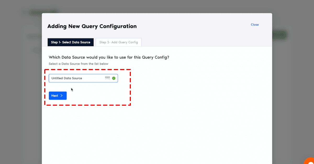 - From this window, choose the relevant Query Config (previously created) from the search bar and click on the Next button.