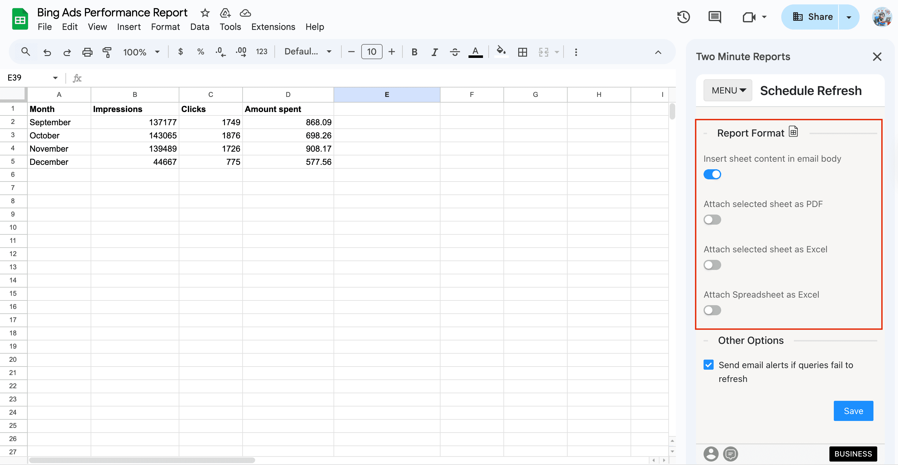 This is where you can use Two Minute Reports’ Bing Ads reporting tool. It lets you connect Bing Ads directly to Google Sheets, so you can streamline and automate performance tracking without manual effort. There are two ways by which you can accomplish this: