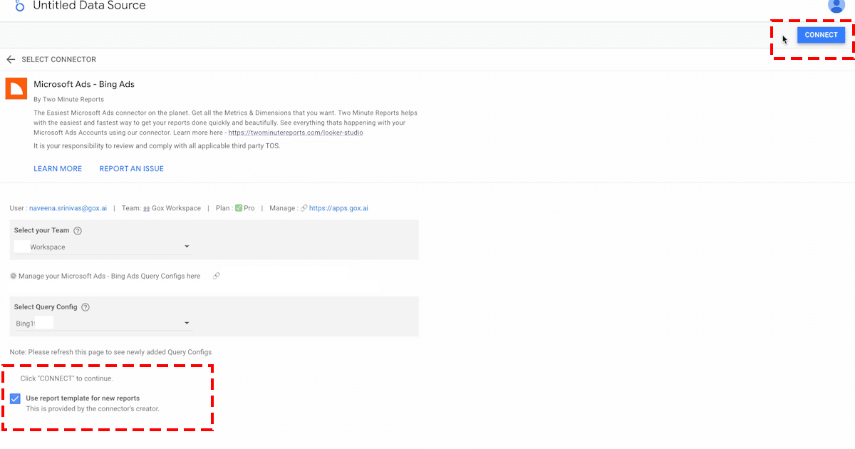 - Once Looker Studio opens, choose the relevant team and check the box next to “Use report template for new reports.” Click on Next to continue.