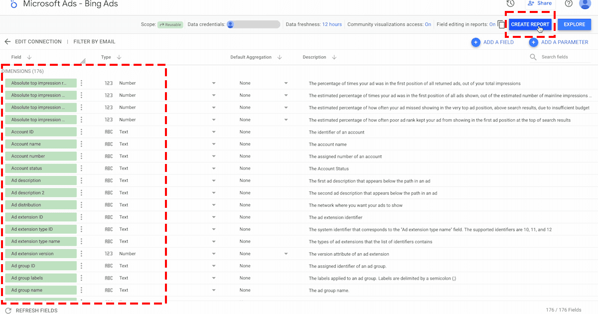 - The next window shows all the available Bing Ads metrics that are ready for the report. You can modify the metrics or click Create Report at the top-right corner.