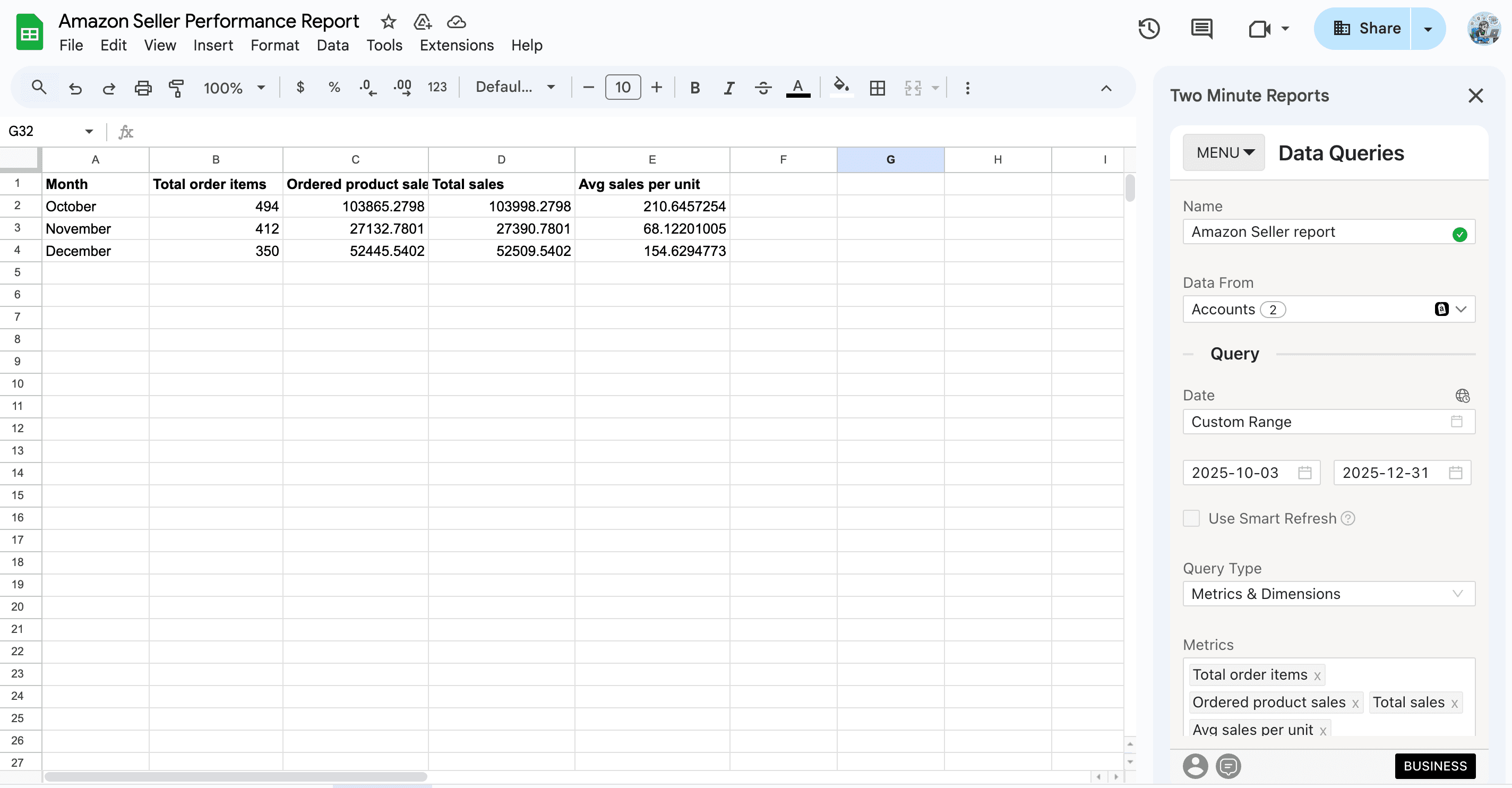 With Two Minute Reports’ Amazon Seller templates, you can build ready-to-share dashboards in both Google Sheets and Looker Studio. All you have to do is connect your Amazon Seller account, specify key KPIs and visualize actionable sales performance insights auto-populated in your dashboard.
