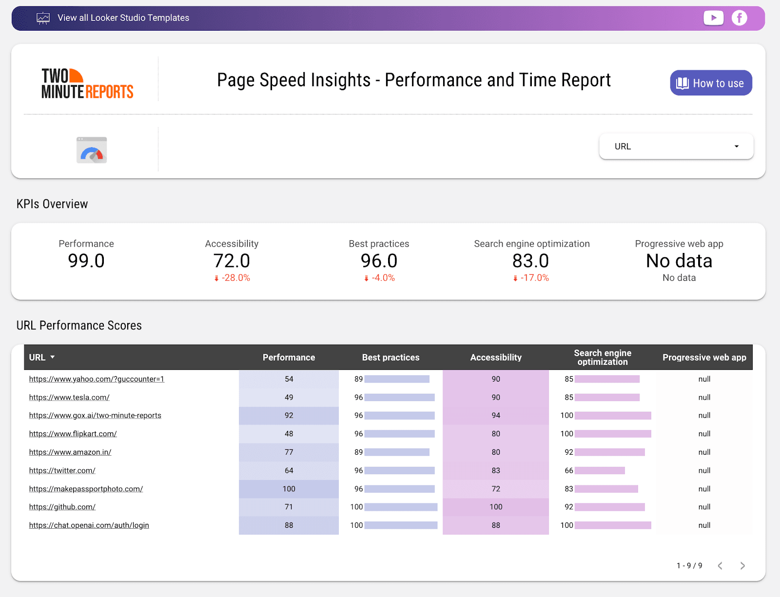 Best for: Technical SEO improvements and user experience optimization.Page Speed Insights - Performance and Time ReportView Template