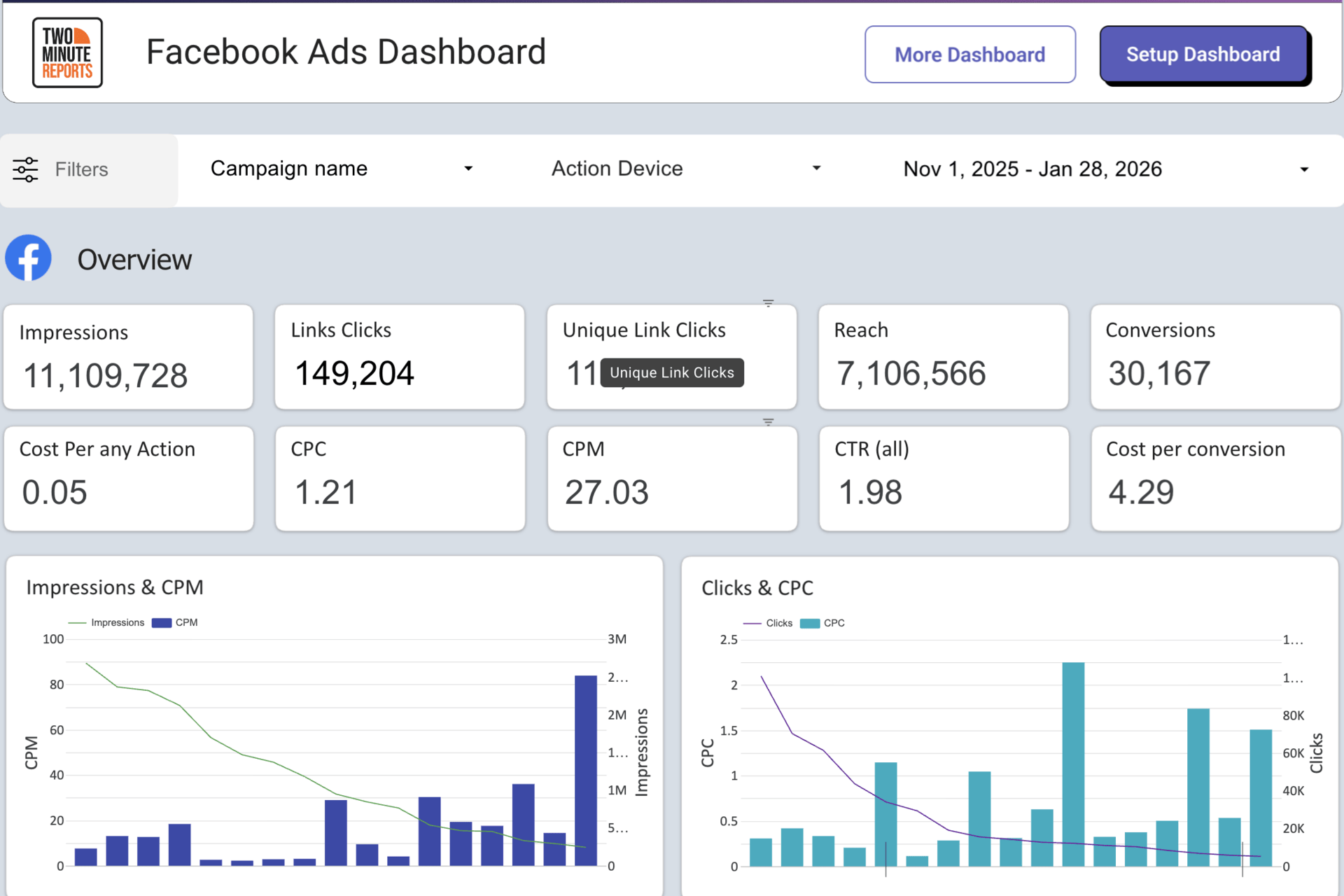 Use Two Minute Reports' pre-built Facebook Ads dashboard templates as your starting point. From there, customise the layout to reflect the metrics that matter to your specific campaigns, whether that is a breakdown by placement, a spend pacing tracker, or a side-by-side creative comparison.