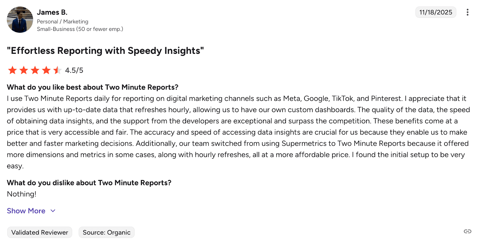 They are built for marketers who need clean dashboards without involving an engineering team. They connect directly to your ad platforms and push data into Looker Studio, Google Sheets, or Power BI on a scheduled basis. Tools like Two Minute Reports is an affordable and feature-rich choice here. The tradeoff is less raw flexibility in exchange for faster setup and easier maintenance.