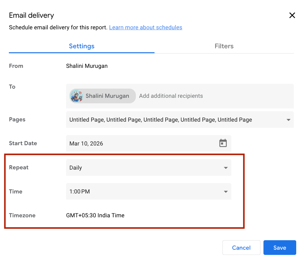 You can add the recipients, include the list of pages, enter the start date, specify the schedule, time, and the timezone. Once set, click Save, and your report will be scheduled for email delivery. The email will contain the PDF attachment of your report, along with the preview of the first page and a link to view the complete report.