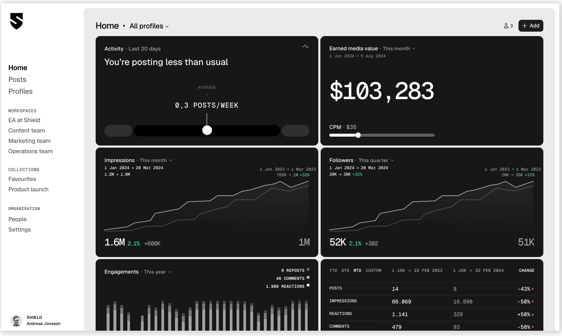 Image Source: Shield AppShield Analytics is a LinkedIn analytics tool built specifically for agencies and teams focused on growing personal brands. It provides detailed insights into post and profile performance, helping you understand which content resonates, what drives engagement, and where you can improve.