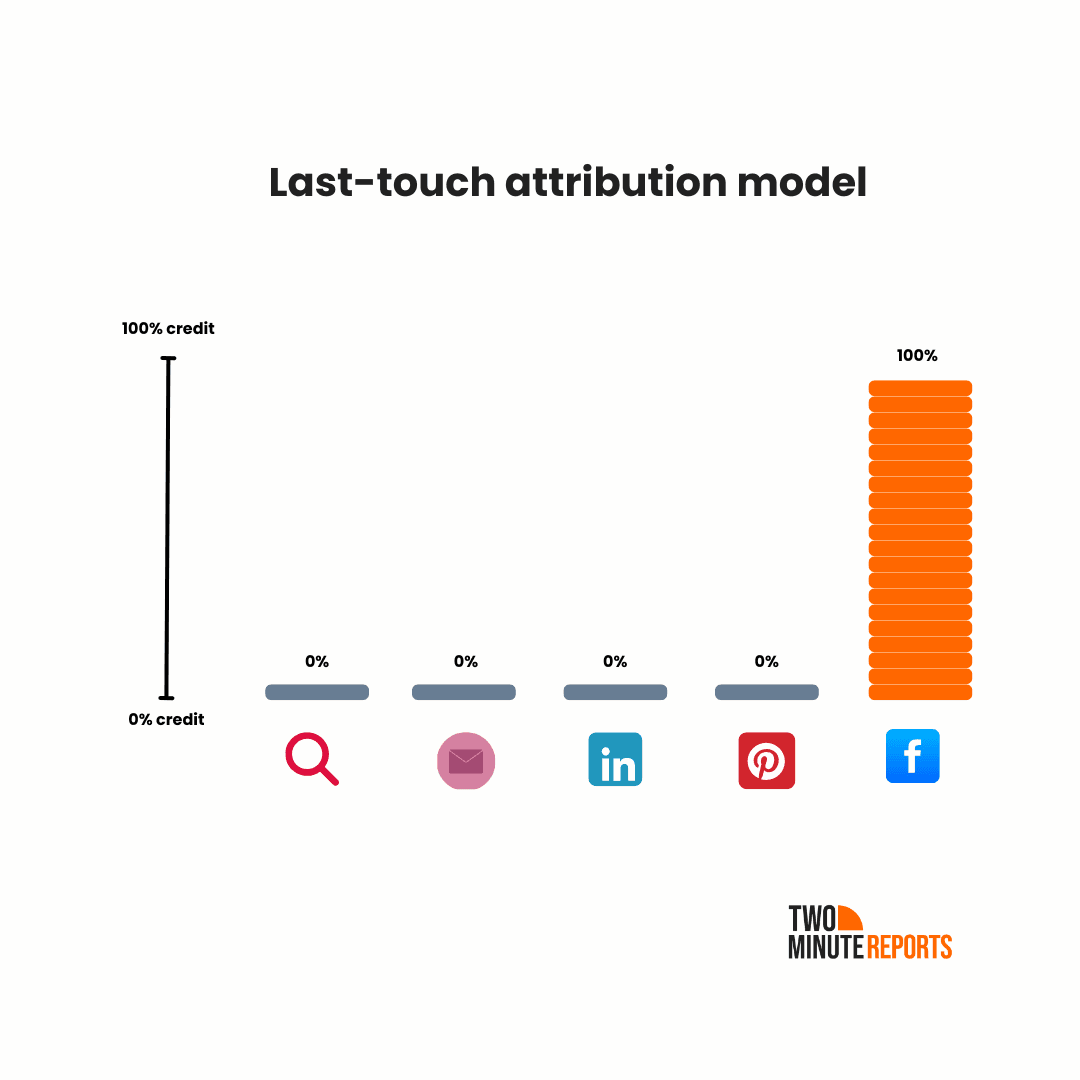 - Last-touch attribution attributes everything to the final action