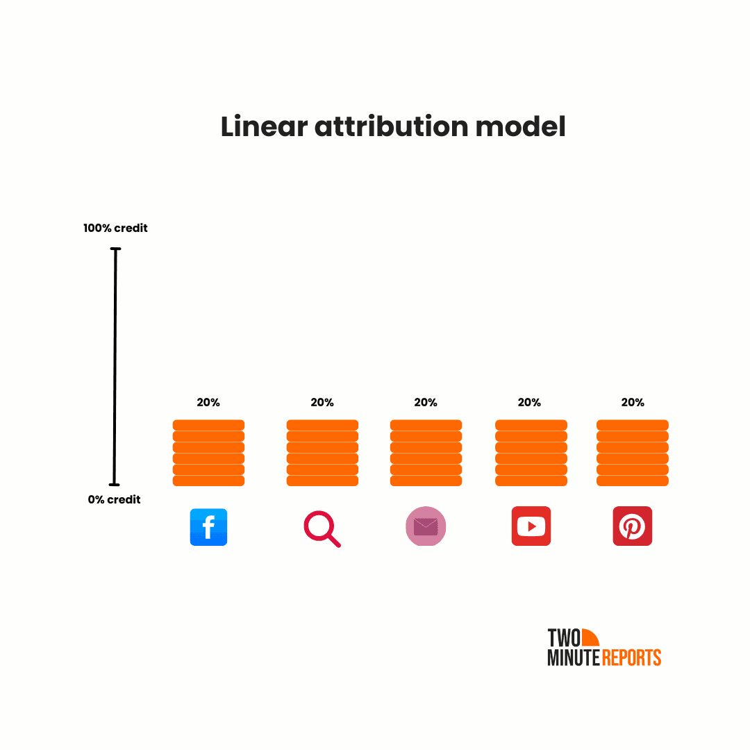 - Example: Before purchasing, a customer interacts with a Facebook ad, a blog post, an email campaign, and a Google ad. Each touchpoint gets an equal share of the credit.