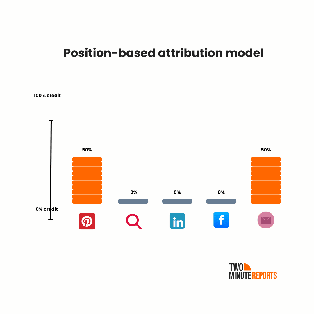 - Position-based attribution (or U-shaped) gives more credit to the first and last interactions while giving less to the middle touchpoints.