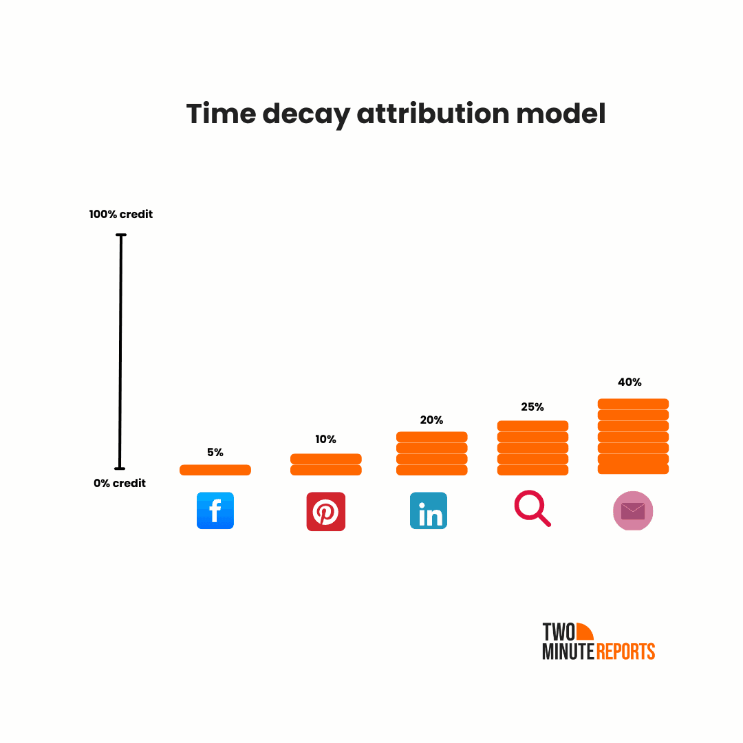 - Time decay attribution favors interactions closer to conversion, recognizing that some channels play a bigger role as customers move through the funnel.