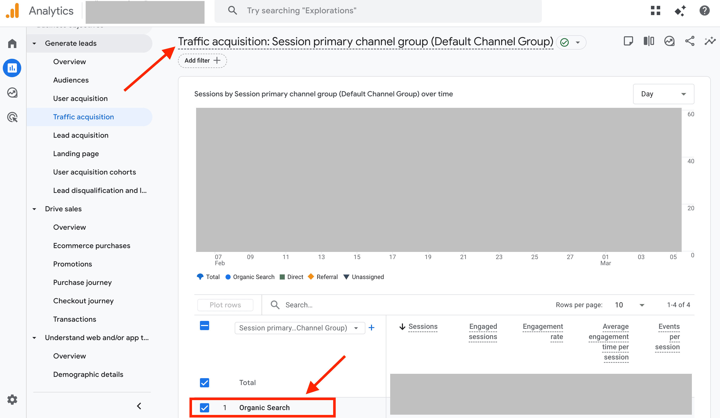 Track in GA4 under Traffic Acquisition, filtered by organic search.