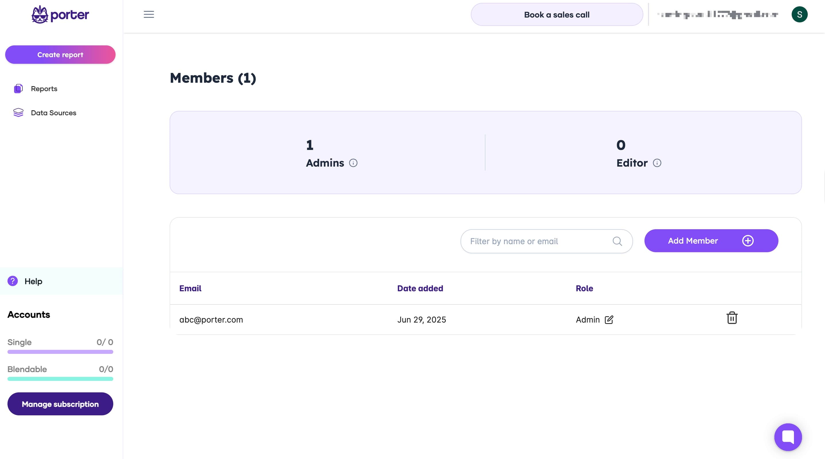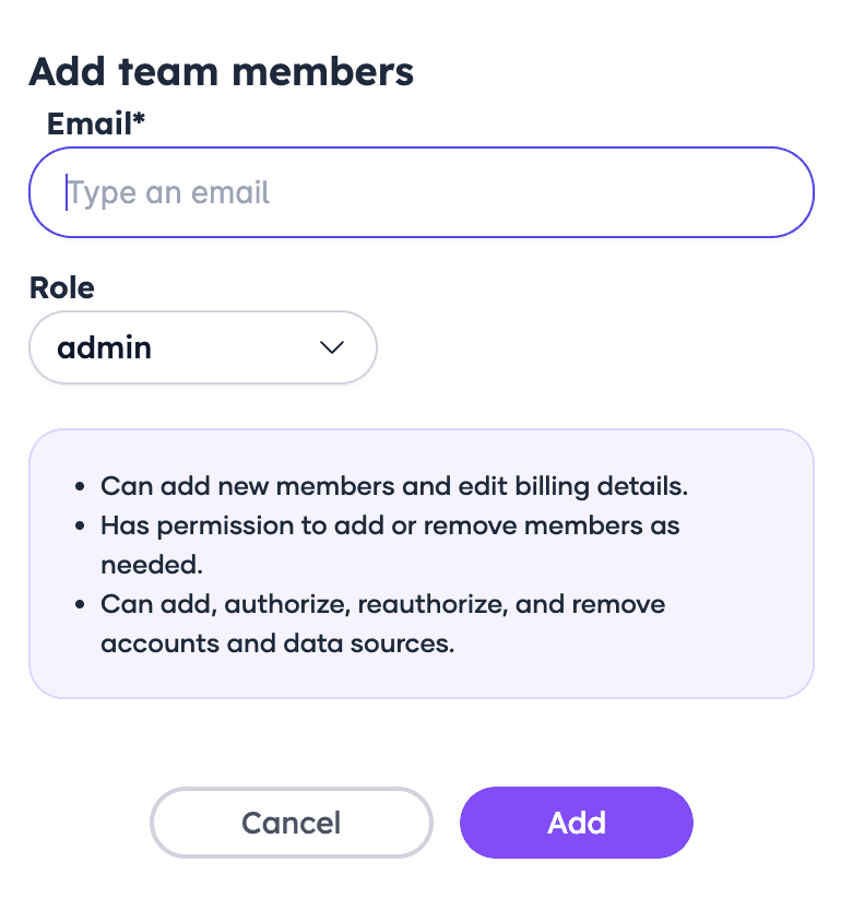 - Admin: Can add or remove new members, edit billing details, authorize, reauthorize, and remove accounts and data sources.