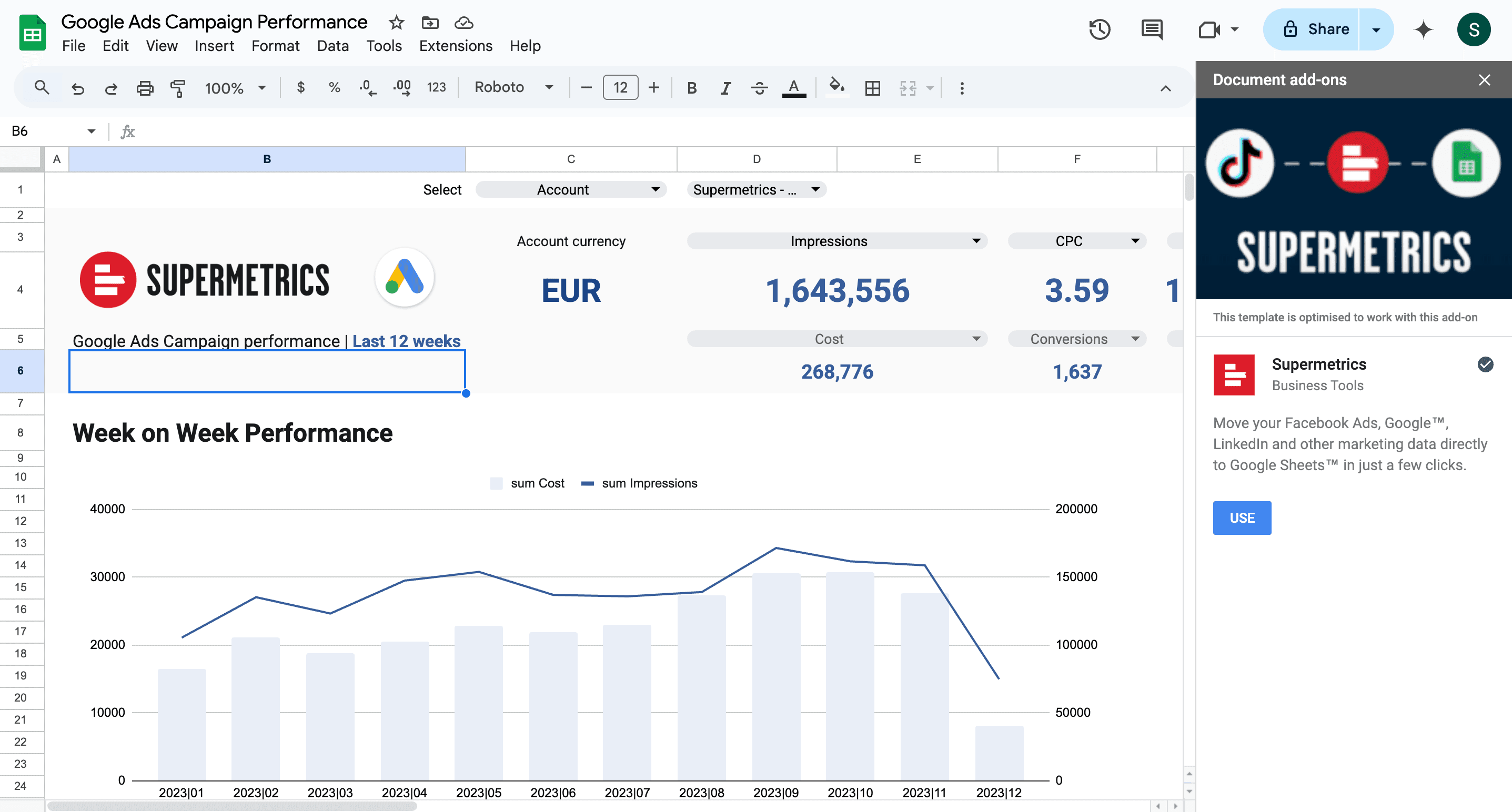 Supermetrics offers a wide range of free templates covering extensive categories such as advertising, ecommerce, social media, etc., for Google Sheets, Looker Studio, Excel, Power BI, and BigQuery. Once you’ve chosen a template, you can fully customize it by adding, removing, or modifying charts and tables, depending on your needs.