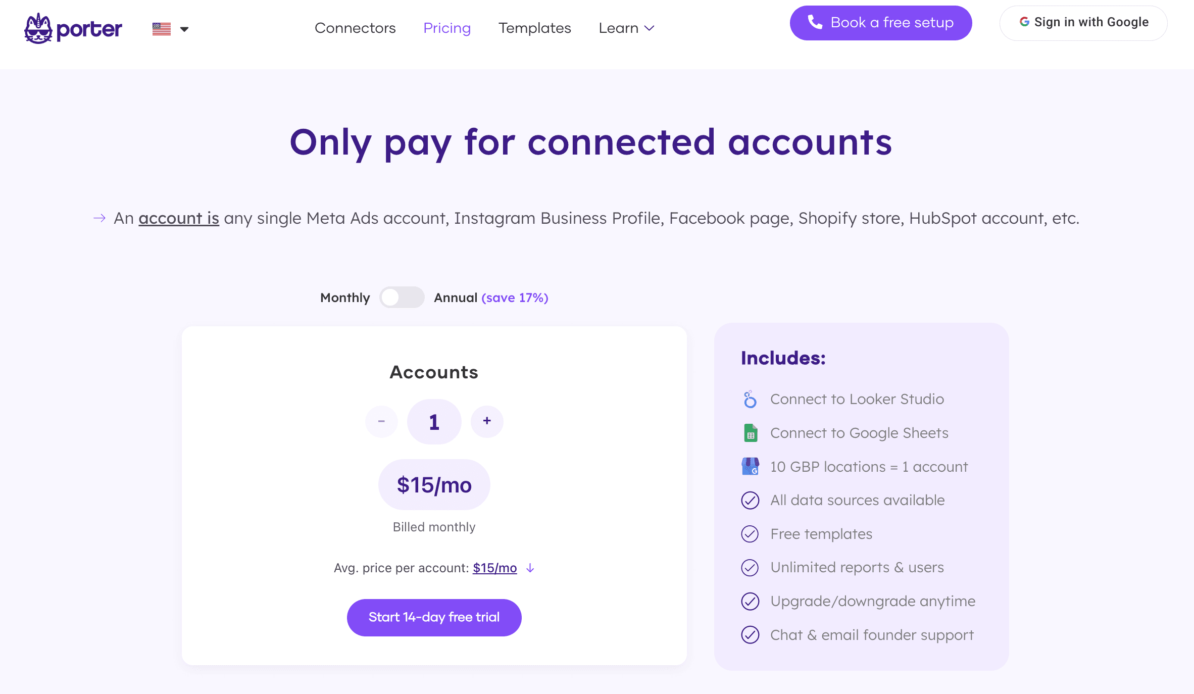 Portermetrics employs a different pricing approach. You will be charged based on the number of connections, i.e., for each additional Google Ads account, it costs $15/month. If you want to add 2 Google Ads accounts, 1 Meta account, 1 Instagram Business profile, and 1 LinkedIn Ads account, it costs $40/month ($8 per connector).