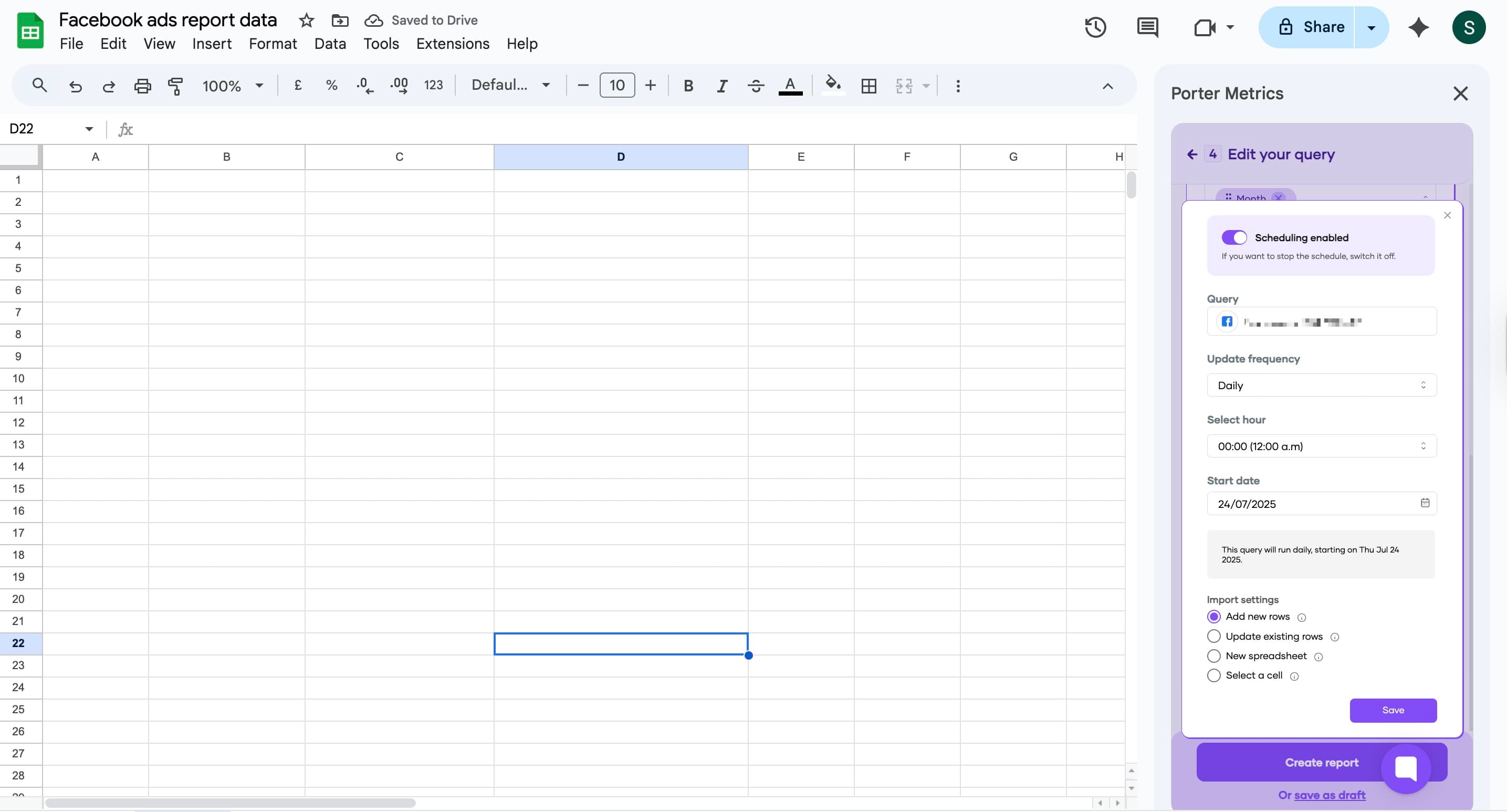 Once you’ve run your query, you can automatically schedule your reports at custom intervals – hourly, daily, weekly, and monthly. Unlike Supermetrics, Porter is simple, efficient, and intuitive in setting up recurring reports.