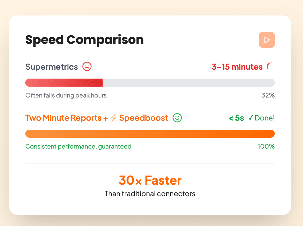 No more broken reports or late-night fixes. With Speedboost, your reports load in under 5 seconds due to smart caching. Deliver lightning-fast, client-ready reports without complex Snowflake or BigQuery setup. 99.9% uptime guarantees a scalable workflow, no matter your data volume. Two Minute Reports retrieves data 30x faster than Supermetrics and other traditional connectors, ensuring consistent, reliable reporting.