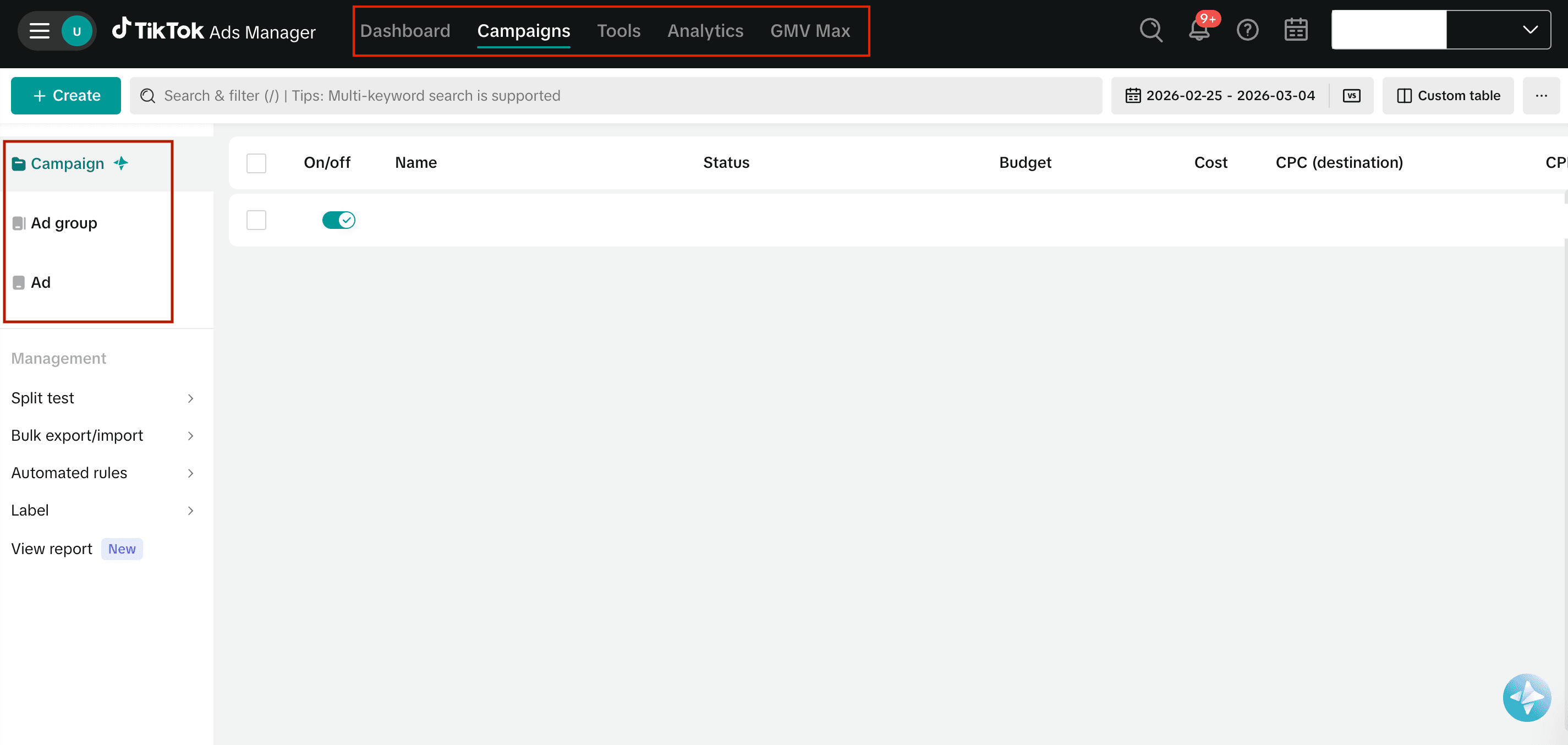 4. The Campaigns tab lets you track the status and key metrics associated with your TikTok Ads campaigns, such as CPC, CPM, Impressions, etc.