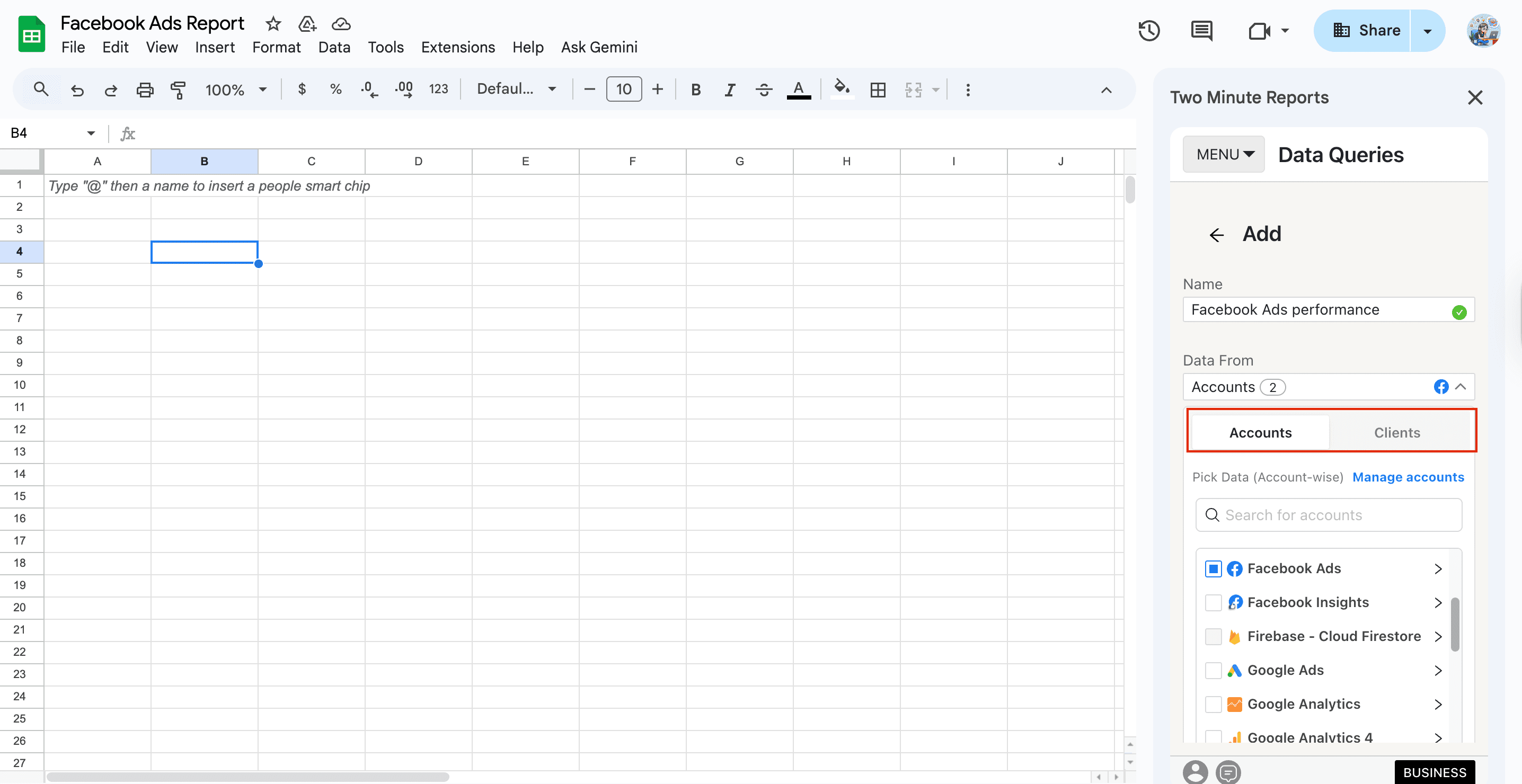 Install the Two Minute Reports add-on from the Google Workspace Marketplace. Next, open your spreadsheet, launch the sidebar, connect your Facebook Ads accounts and visualize actionable campaign performance insights within minutes, no manual mapping required.