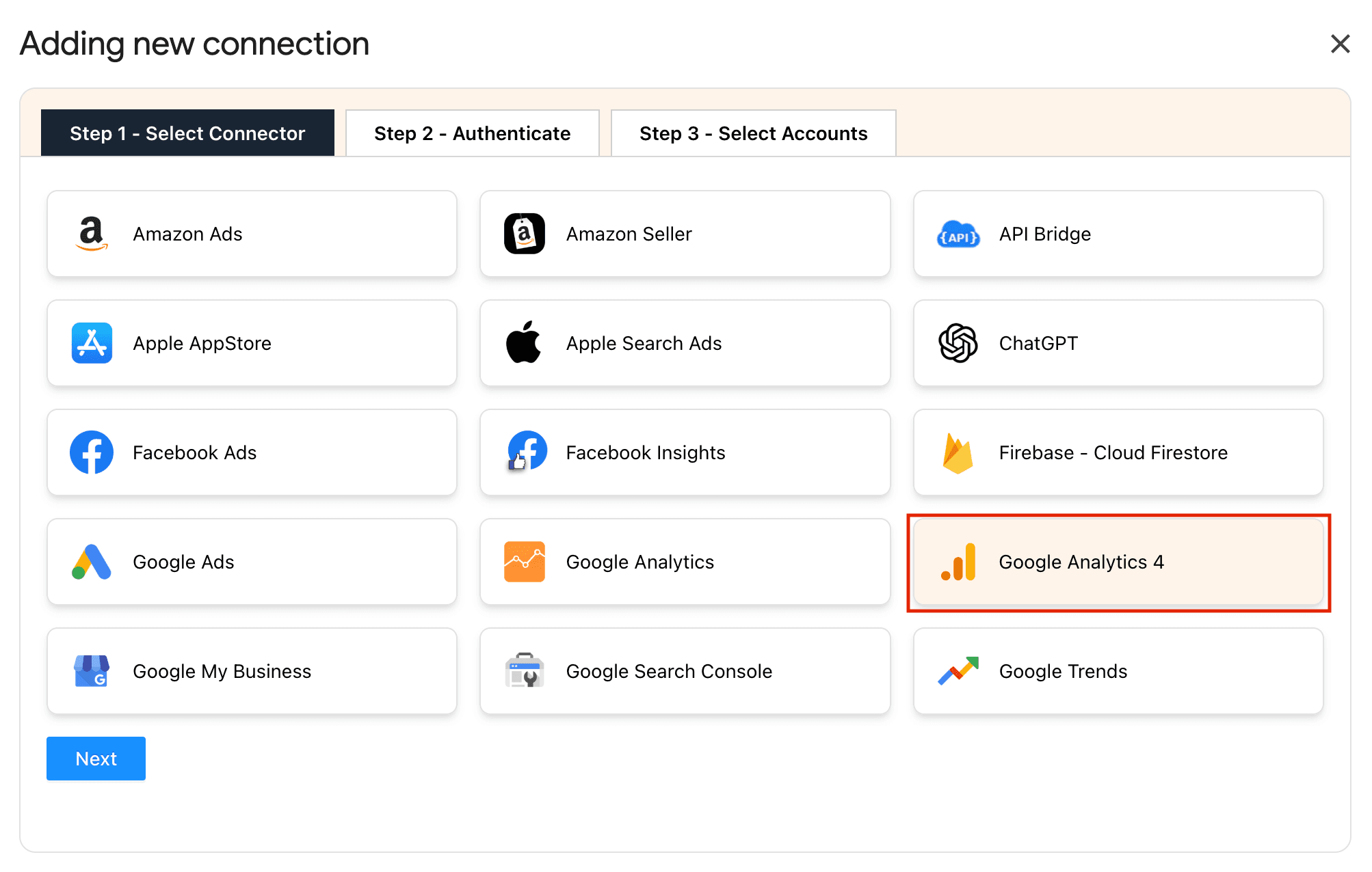 - Select GA4 Connector from the list of options. Next, authorize your Connection by specifying the login credentials.