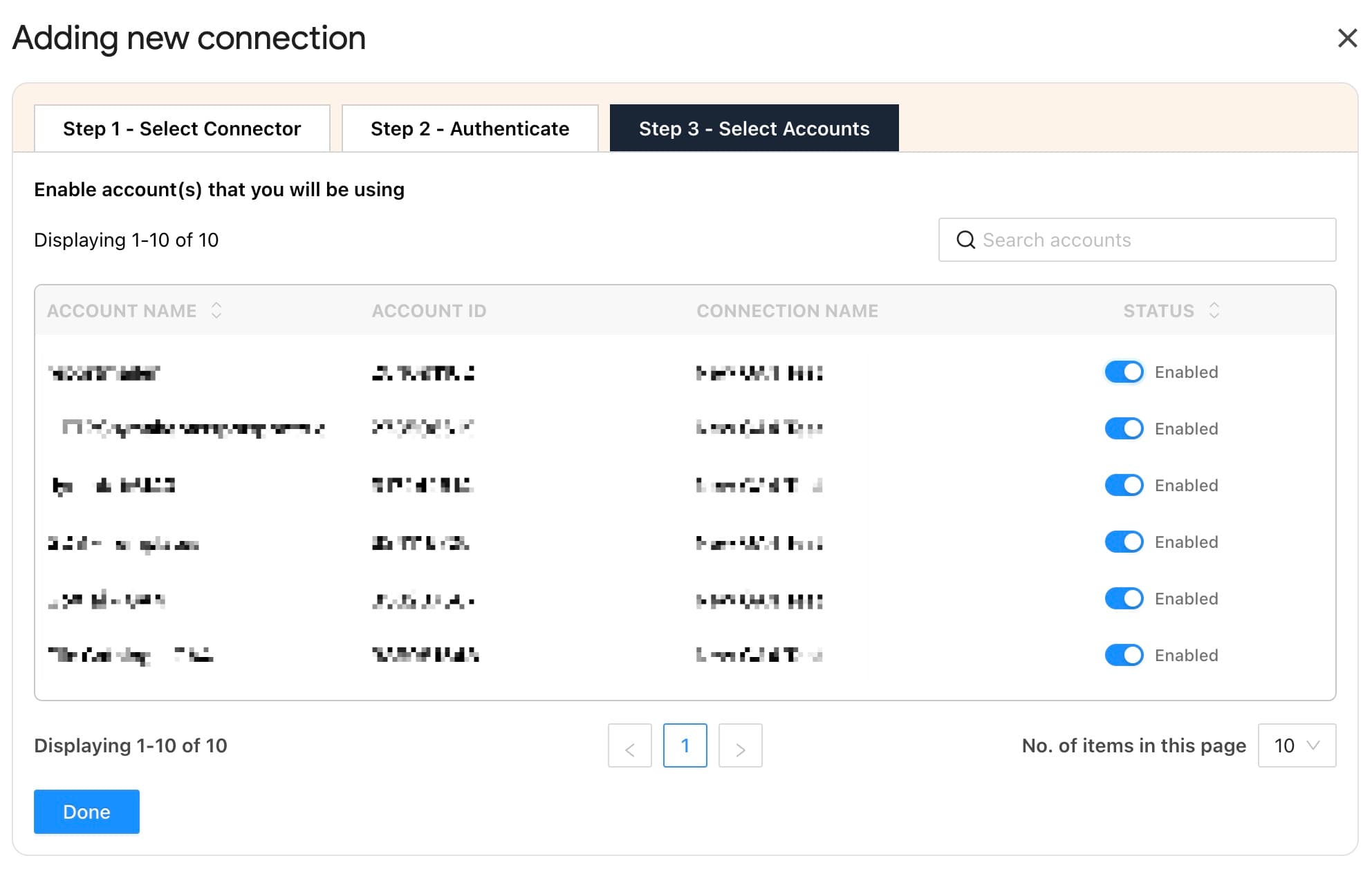 - Enable the toggle for the accounts you want to run queries. Please note that you cannot extract data for disabled accounts.