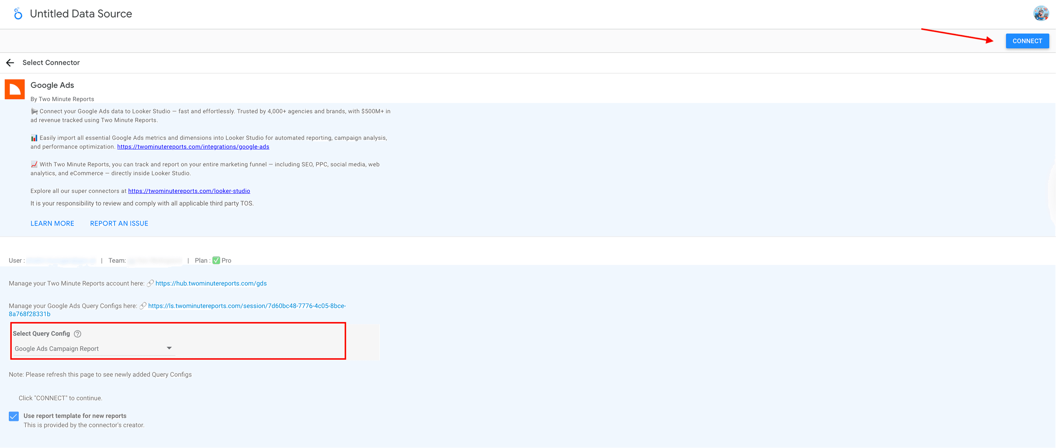 You can access our free, ready-to-share Google Ads Looker Studio templates to streamline campaign tracking. Once you click “Use Template”, you can select the Query Config, customize the Looker Studio dashboard and deliver impactful insights to your clients or stakeholders.
