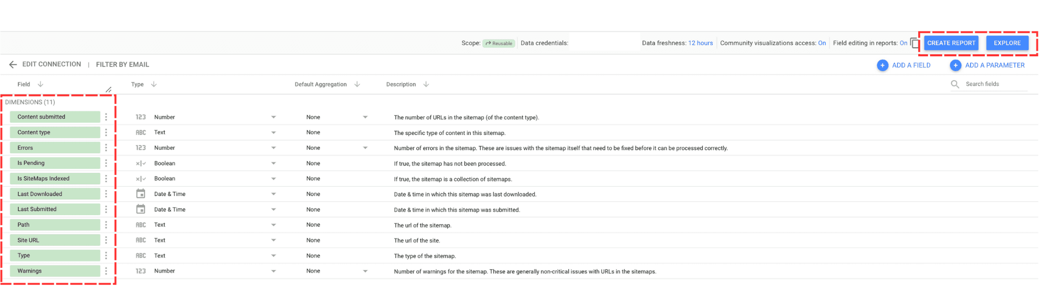 - The next window shows all the available Google Search Console metrics and dimensions, which you can include in your Looker Studio report. You can either modify the metrics or click the Create Report button at the top right corner.
