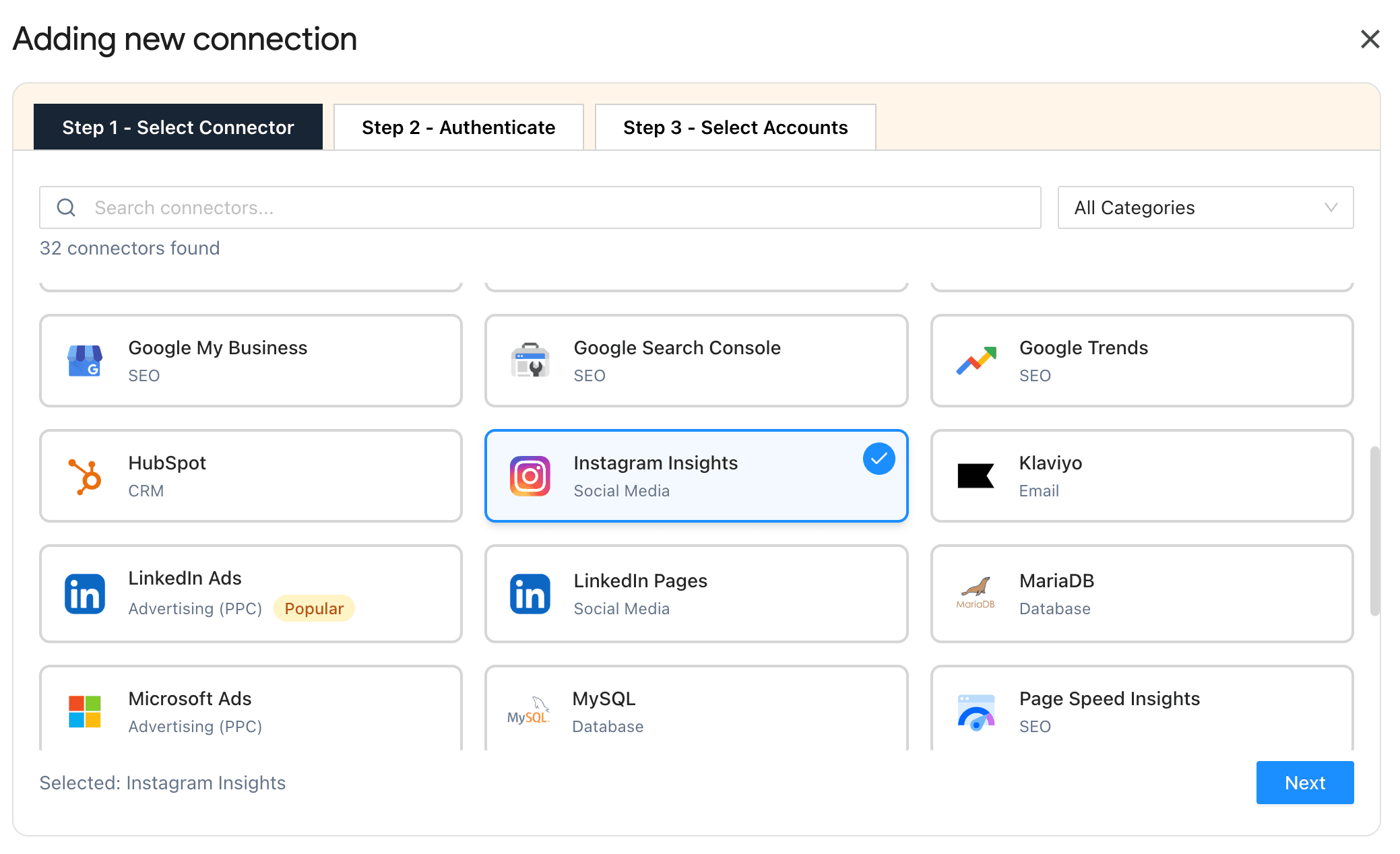 Once this is done, the “Adding new connection” dialog box appears. Next, you can follow the steps below to authenticate your Instagram Insights connection with Two Minute Reports.