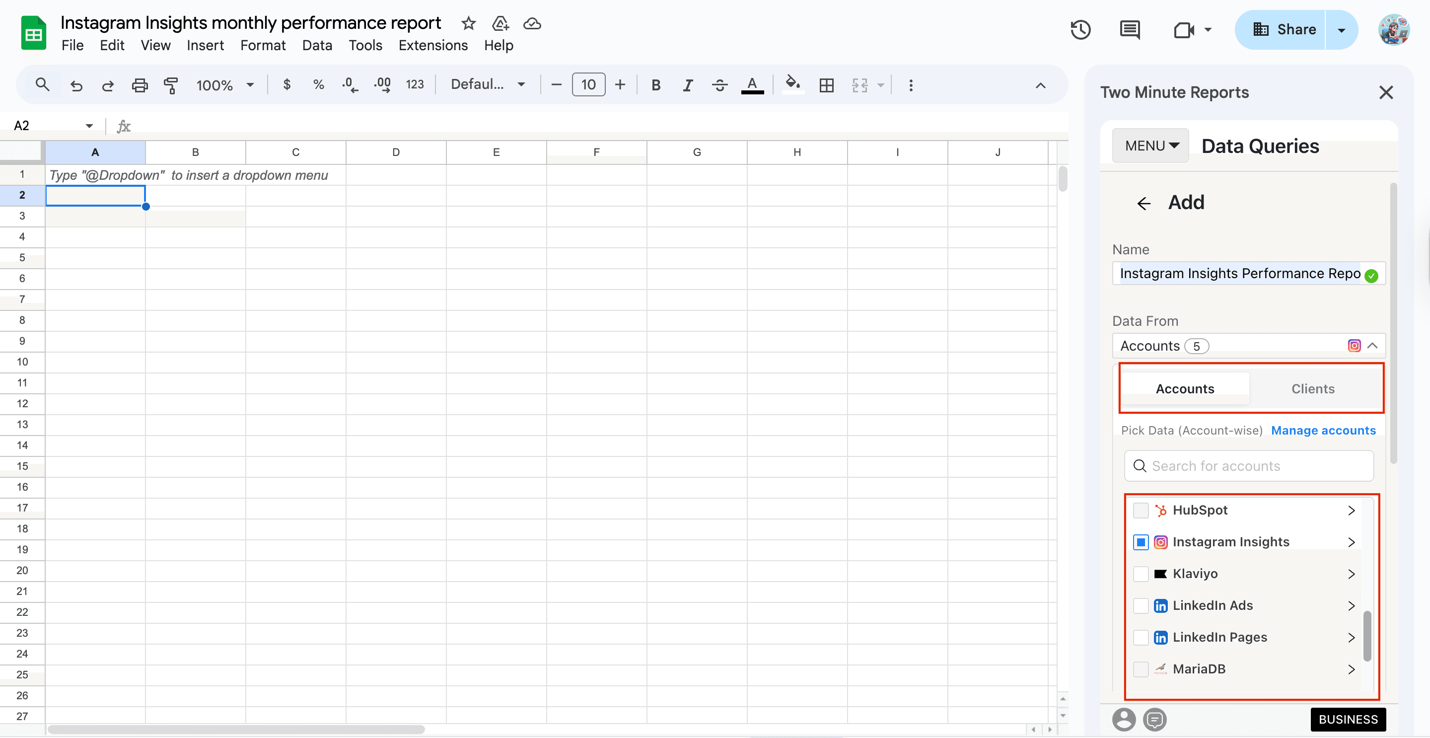Install the Two Minute Reports add-on from the Google Workspace Marketplace. Next, open your spreadsheet, launch the sidebar, and connect your Instagram Insights accounts. Then specify your metrics, dimensions, date range and click Run query. Visualize actionable performance insights without having to manually switch spreadsheets.