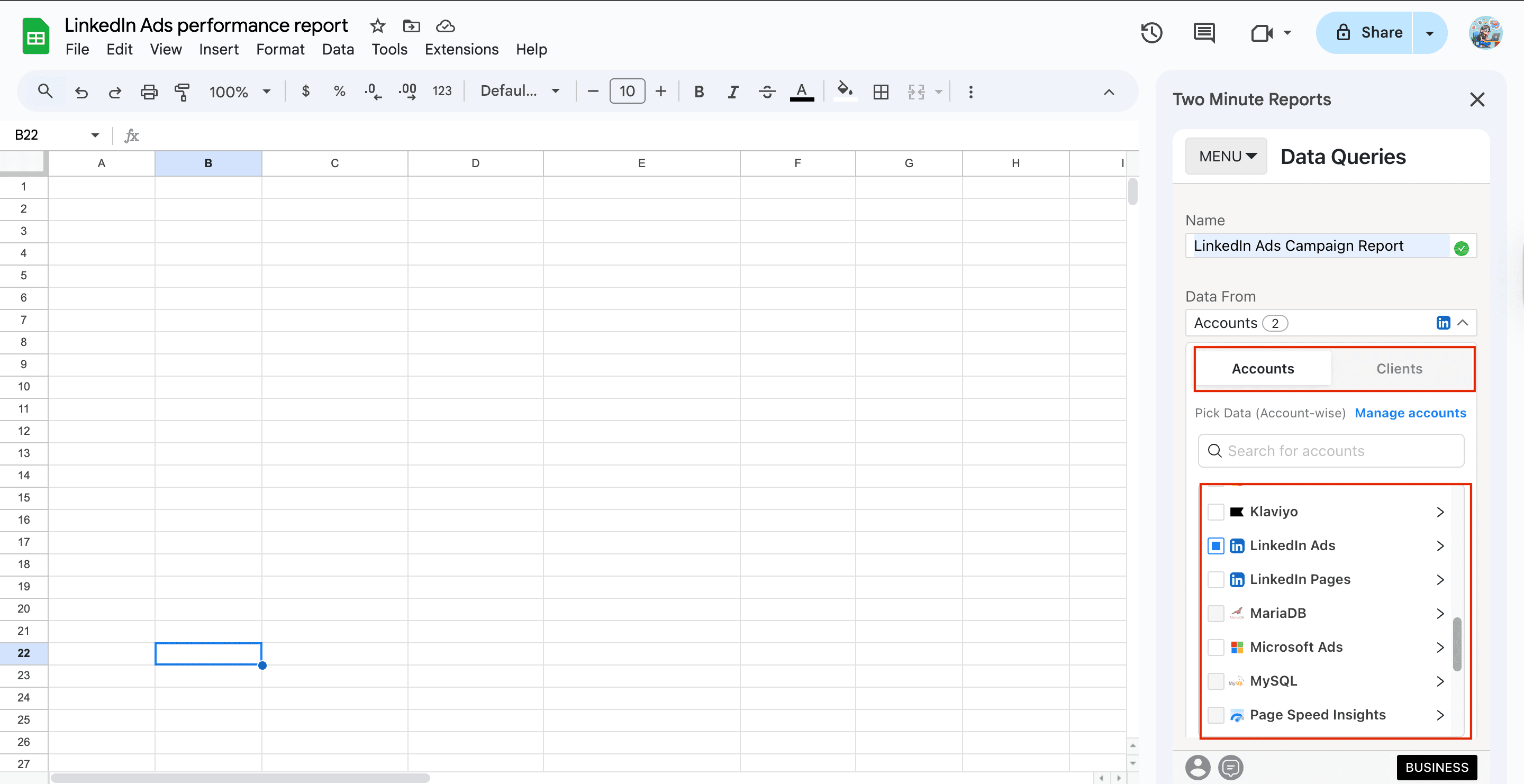 You can access our free, ready-to-share LinkedIn Ads Google Sheets templates to streamline campaign tracking. Once you click “Use Template”, you can launch the Two Minute Reports add-on, import your client’s LinkedIn ad accounts, run queries and auto-populate the dashboard with meaningful insights.