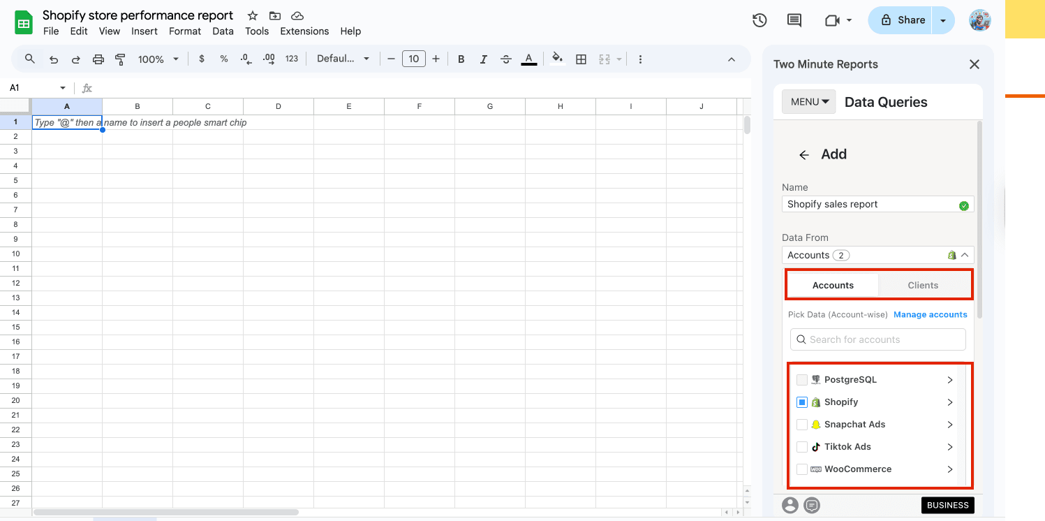You can install the Two Minute Reports add-on from the Google Workspace Marketplace. Next, open your spreadsheet, launch the sidebar, connect your Shopify store accounts and visualize actionable campaign performance insights within minutes, no manual mapping required.