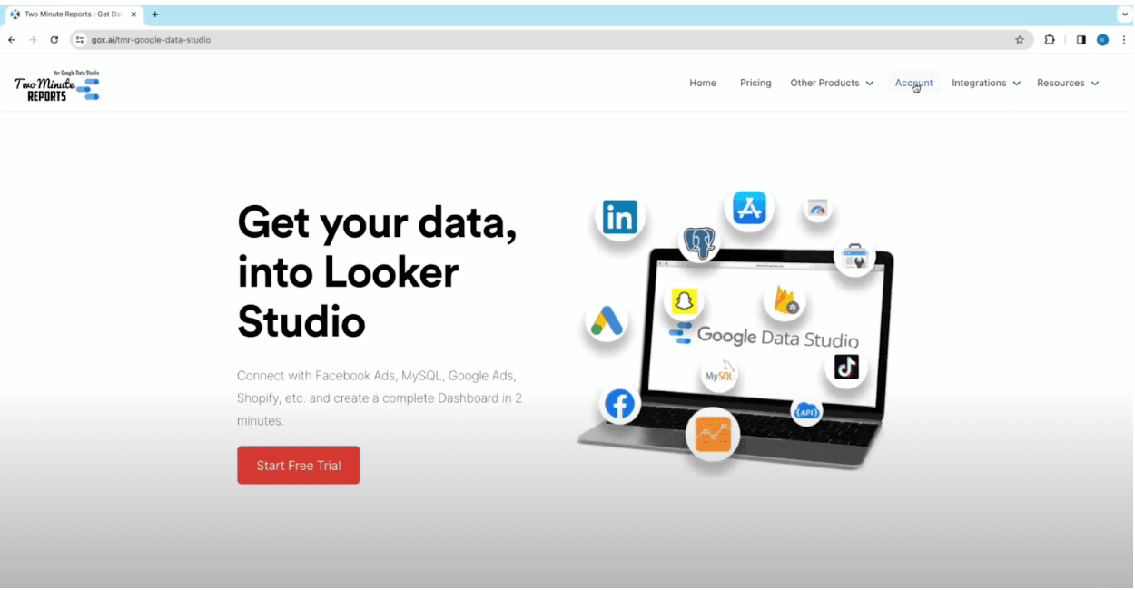 - Click on Products -> Two Minute Reports for Looker Studio. It will redirect you to the Two Minute Reports page. Now click on the Accounts option.