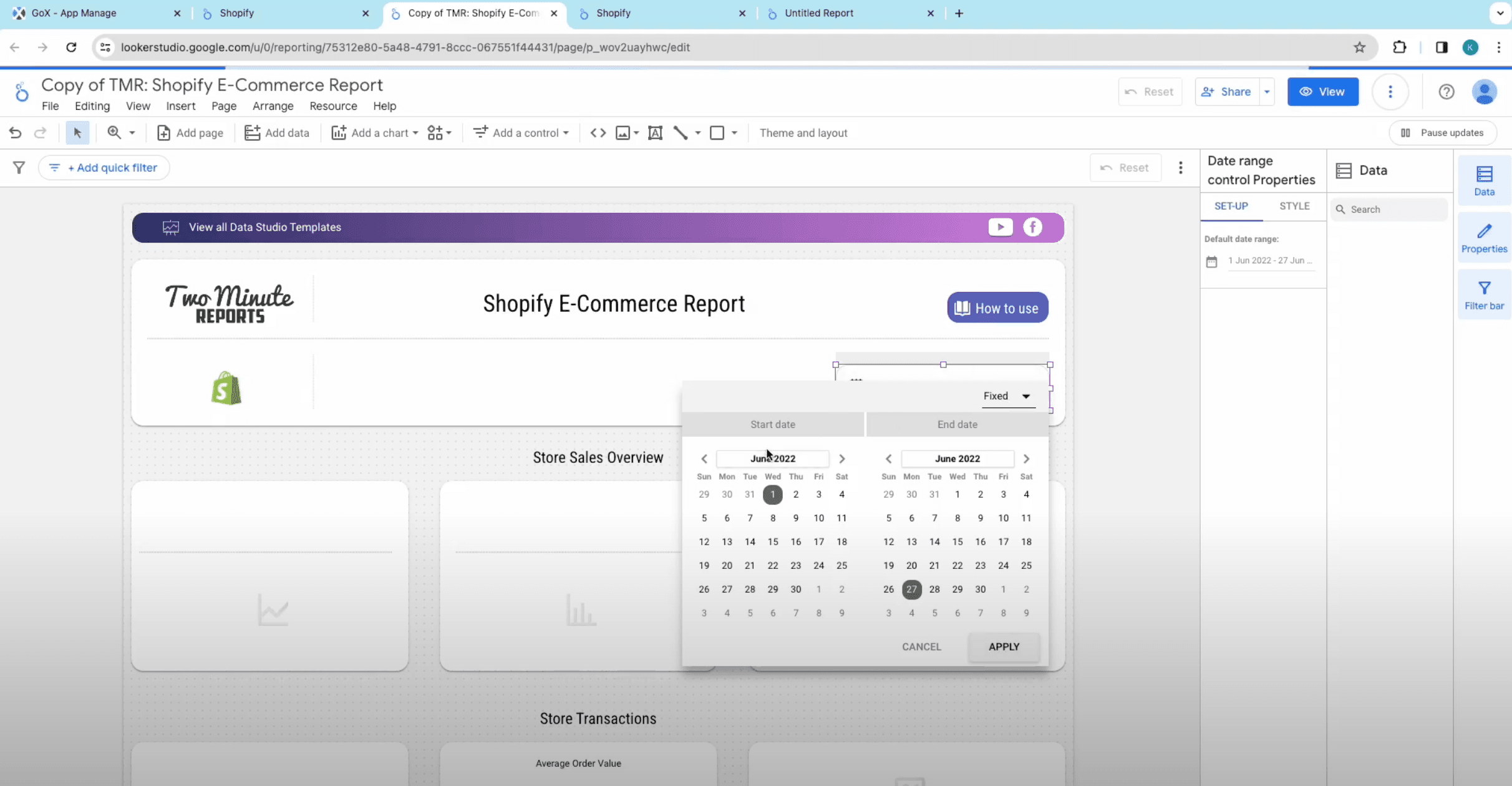 - A Google Data Studio doc for Shopify data will open up. You will see graphs and reports for various Shopify metrics like stores transactions, conversion rates, average order value, etc.