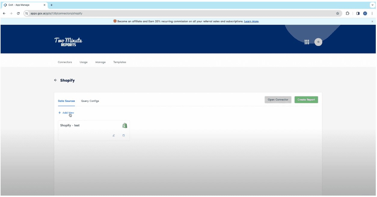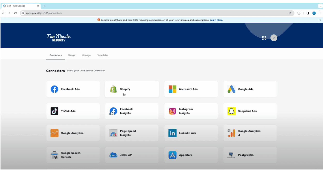 - Use the Two Minute Reports and search for our Shopify connector.