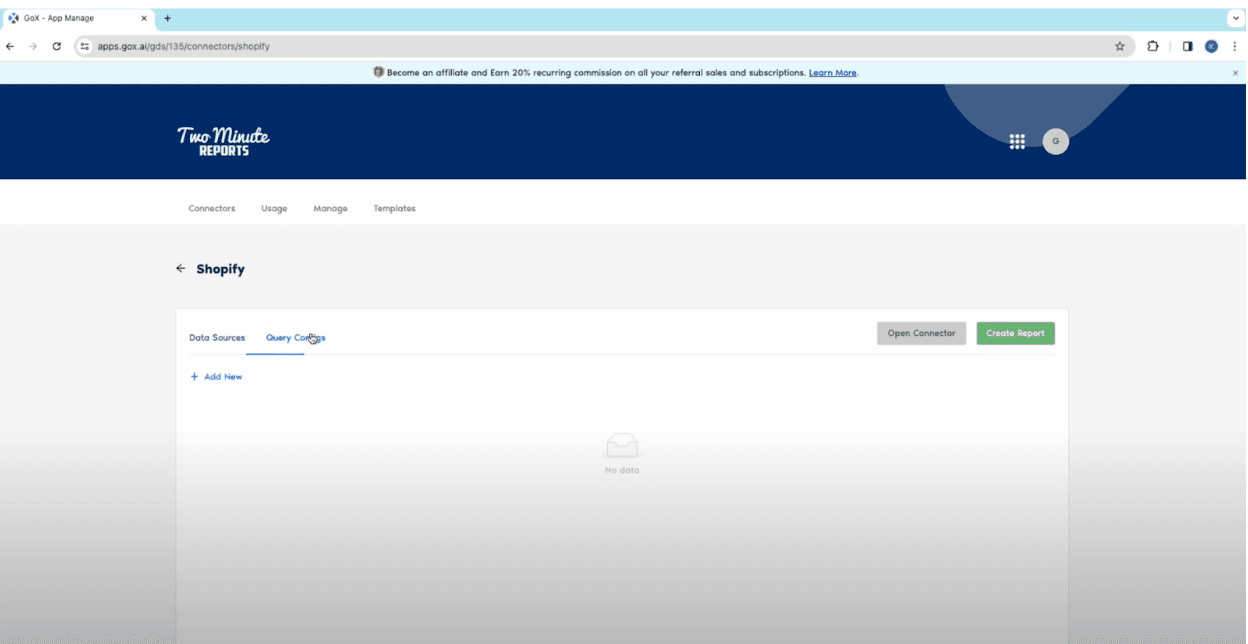- Once you have successfully connected to your Shopify store, move to the Query configs tab and click on Add New.