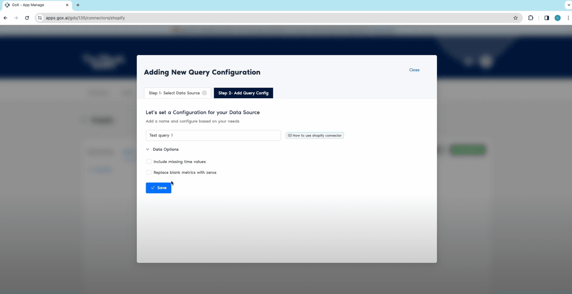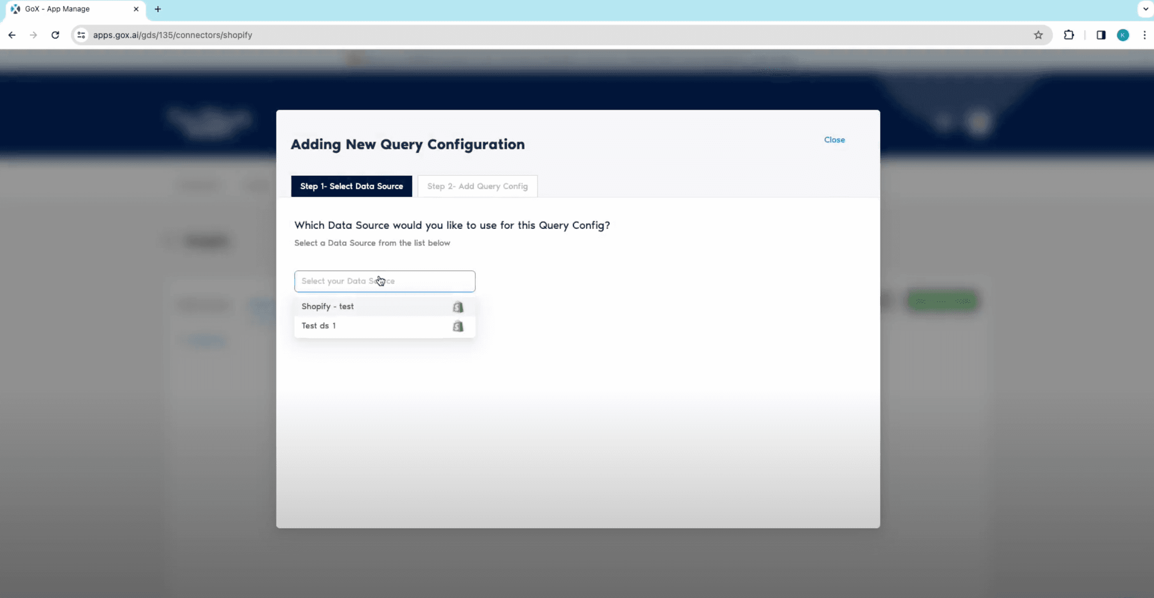 - Select Shopify-> add connection details-> save and authorize. In Query Configs, add a configuration and set all your Data Source and then click on Next.