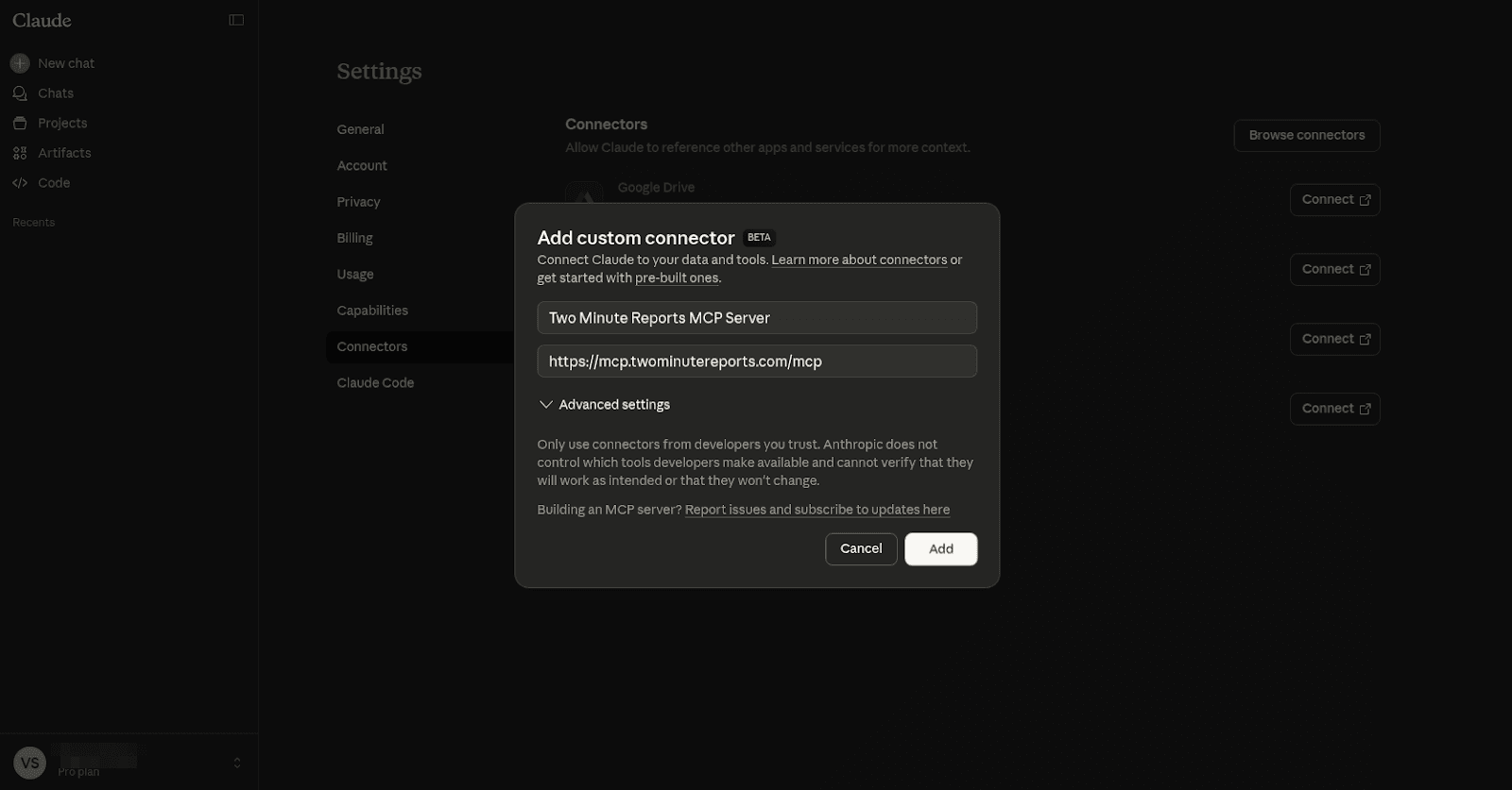 5. In the Remote MCP server URL field, paste the following URL and click Add: https://mcp.twominutereports.com/mcp